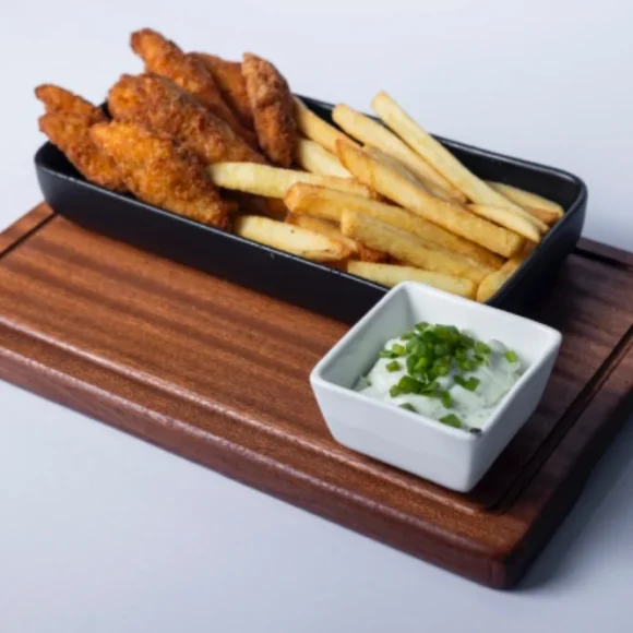 Crispy golden fish fillets served with thick-cut fries and a refreshing herb sour-cream dip. Simple, classic, and always satisfying.